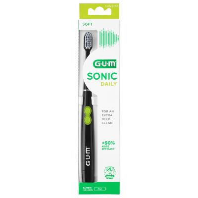 GUM Sonic Daily Brosse à Dents Souple 4100 - Couleur : Noire est une brosse à dents sonique à pile aux brins souples. Elle permet un nettoyage en profondeur là où la plaque dentaire s'accumule. Elle est 50% plus efficace pour atteindre les espaces interdentaires et élimine 47 fois plus de plaque dans le sillon gingival.