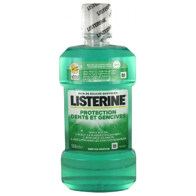 LISTERINEProtection dents et gencivesBain de bouche quotidienRéduit la plaque efficacementAide à prévenir les gencives sensiblesRafraîchit l'haleineMenthe fraîche500mlLISTERINE® Protection Dents et Gencives procure une protection pour des dents et des gencives plus saines et pour une sensation de propreté qui dure 3x plus longtemps que le brossage seul. Pour des dents plus fortes et des gencives plus saines en 2 semaines. Utilisé deux fois par jour en complément du brossage, LISTERINE® Protection Dents et Gencives procure une protection pour des dents et des gencives plus saines et pour une sensation de propreté qui dure 3x plus longtemps que le brossage seul. C’est cliniquement prouvé*, LISTERINE® Protection Dents et Gencives a une triple action : 1. Réduit la plaque 2. Renforce l'émail : Contient du fluor pour renforcer les dents. 3. Aide à prévenir les gencives sensibles. *Étude sur la réduction de la plaque.-Renforce les dents pour protéger contre les caries. Réduit la plaque pour garder des gencives saines. Agit même sous le bord des gencives-Pour une protection complète, l’UFSBD recommande l’utilisation de ce bain de bouche quotidien, en complément du brossage, matin et soir.-Aide à prévenir les gencives sensibles.-Bouteille 100% recyclable*. Contient 50% de plastique recyclé. Jeter la bouteille avec le bouchon fermé. *sans le sceau de sécurité"