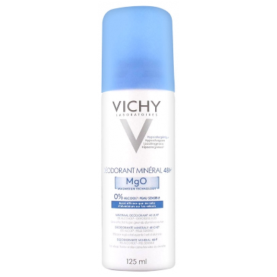 VICHYDéodorant Minéral 48hSans sels d'aluminiumPeaux sensiblesSpray 125ml Efficacité et Tolérance Optimales. Sans compromis.Pour les femmes à la recherche d'un déodorant sans sels d'aluminim, avec un niveau d'efficacité maximal sans compromis sur la tolérance.Association de l'oxyde de magnésium et de 5 minéraux pour une efficacité anti-odeur jusqu'à 48h, à la Provitamine B5 apaisante.