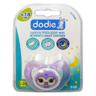 DODIESucette physiologique en siliconePour la nuit18 mois et plusColoris et motifs selon disponibilitésConvient aux bébés de plus de +18 mois.Conçue pour la nuit, le bouton phosphorescent permet de retrouver facilement la sucette.Bouclier en tritan, confortable et léger qui permet à bébé de la garder en bouche facilement.Téterelle en silicone de forme physiologique (ou biseautée) qui s'adapte idéalement au palais de bébé.La finesse de la téterelle respecte le développement naturel de la bouche de bébé.Les trous de ventilation permettent une meilleure circulation de l'air et réduisent ainsi le risque d'irritation de la peau de bébé.Le système du bouton permet un retrait facile et sécurisé de la sucette.