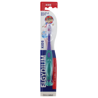 ELGYDIUM KIDSBrosse à dents enfants SoupleAdaptée aux dents de lait2-6 ansColoris et motifs selon disponibilité La brosse à dents ELGYDIUM Kids 2 à 6 ans est spécialement conçue pour les petites mâchoires. Elle accompagne, au fil des années, les enfants vers de plus en plus d’autonomie. Ses brins en nylon de qualité supérieure souples et finement arrondis respectent les dents de lait et les gencives et rendent le brossage quotidien agréable et tout doux. Ses brins concaves épousent parfaitement la forme des dents de lait, pour un nettoyage complet de la surface dentaire. Ses brins colorés, au centre, ont quant à eux été disposés là pour aider les enfants à bien doser le dentifrice, sans excès. Son manche antidérapant et ergonomique tient bien dans la main, même lorsqu’elle est mouillée. Sa ventouse à l’extrémité la maintient rangée à la verticale, prête pour la prochaine utilisation.• ERGONOMIQUE et douce pour les dents de lait et les gencives• LUDIQUE pour motiver les enfants à se brosser les dents• ÉDUCATIVE grâce aux brins colorés qui, au centre de la brosse à dents enfant, indiquent la juste quantité de dentifrice à utiliser