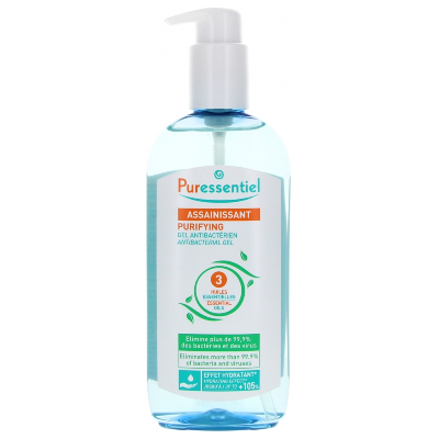 PURESSENTIELAssainissantGel antibactérien3 huiles essentielles Elimine 99.9% des Virus et bactériesEffet hydratant250mlCe gel hydro-alcoolique aux 3 huiles essentielles est parfait pour se désinfecter les mains sans eau, sans savon et sans rinçage à n’importe quel moment de la journée. Désinfectant, ce gel anti-bactérien, à l'aloe vera, ne vous desséchera pas les mains !Virus, bactéries : 99,9% détruits dès les 1ères minutes