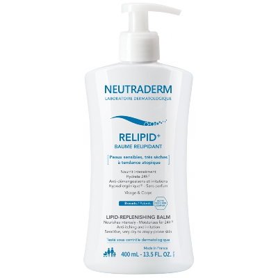NEUTRADERMRelipid+ Baume RelipidantPeaux sensibles, très sèches à tendance atopiqueNourrit intensément Hydrate 24hAnti-démangeaisons et irritationsHypoallergénique, Sans parfumVisage et Corps400mlLe Baume Relipidant Relipid + est une INNOVATION DERMATOLOGIQUE visage et corps intensément nourrissante à la tolérance maximalisée pour prendre soin de toute la famille et du nourrisson dès la naissance avec une formule hydratation 24 h, anti-démangeaisons, anti-irritations. Issu de la gamme Neutraderm résultant de 10 ans de recherche, ce baume relipidant est spécifiquement conçu pour redonner tous ce dont les peaux sensibles, très sèches à tendance atopique ont besoin: une excellente hydratation.Les quatre actifs clés:l'actif naturel breveté "Active Oligo Skin Complexe", issu de la mer Iroise, espace préservé, pur classé à l'UNESCO est gorgé de richesses en minéraux, oligo-éléments et d'un ph neutre pour une peau en pleine santé, apaisée, reminéralisée, restructurée. Et une barrière cutanée restaurée pour protéger la peau de la déshydratation et d'agents indésirables (allergènes, microbes..).une association d'huiles végétales nourrit la peau.l'allantoïne adaptée aux peaux sensibles possède des propriétés réparatrices, apaisantes, adoucissantes tout améliorant la capacité de la peau à retenir l'eau.le prébiotique veille au microbiome de la peau ces micro-organismes protecteurs vivant sur et dans le corps pour une barrière cutanée renforcée.La peau est nourrie, hydratée confortable et se régénère de jour en jour, application après application.
