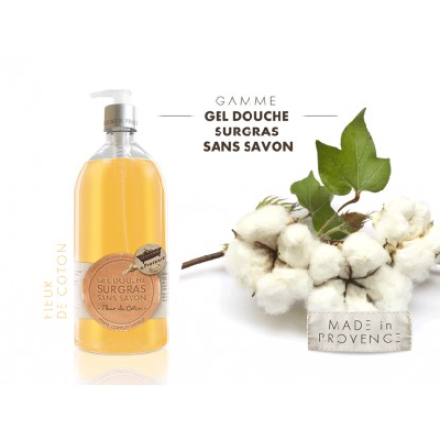 Le gel douche surgras sans savon pêche est également disponible, élaboré à partir de matières premières d'origine naturelle soigneusement sélectionnées par Les petits bains de Provence. Il nettoie votre peau sans l'agresser et contient de la glycérine végétale aux propriétés nourrissantes.