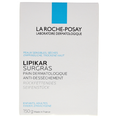 LA ROCHE POSAYLipikar Pain Surgras Pain physiologique anti-dessèchementPeaux très sèches150gToilette quotidienne des peaux très sèches de l'enfant et de l'adulte. Nettoie la peau sans l'agresser. Le beurre de Karité apporte les lipides nécessaires à la peau, respectant ainsi son film protecteur naturel. Le complexe EDTA, capteur de calcaire, protège la peau des effets dessèchants de l'eau. Résultat : parfaitement nettoyée, nourrie et protégée, la peau retrouve souplesse et douceur.