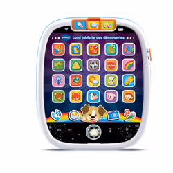 Lumi tablette des découvertes - 9 - 36 mois La première tablette de Bébé pour jouer à imiter Papa et Maman. 25 touches tactiles dont 20 lumineuses pour faire le plein de découvertes : les chiffres de 1 à 10, les formes, l'alphabet en chanson, les animaux, découvrir le temps qu'il fait, écouter son ami le chien parler. Le petit chien guide Bébé dans ses découvertes, lui raconte des histoires et l'encourage. Un bouton Maison lumineux pour déclencher des sons rigolos et des phrases amusantes. 3 modes de jeux : Exploration, Découvertes et Musique. 20 mélodies et 3 chansons accompagnent Bébé dans ses découvertes. Réglage du volume sonore et arrêt automatique. Boîte Try-me. Fonctionne avec 3 piles LR03 fournies.