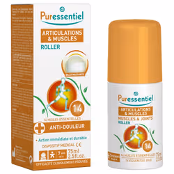 PURESSENTIELArticulations et musclesRollerSoulager les douleurs musculo-articulairesDétendre, apaiser les contractures musculaires14 huiles essentielles100% naturelles et puresDispositif médical75mlCe roller Articulations & Muscles Puressentiel est conseillé aux sportifs pour optimiser l’effort. Soulageant les courbatures, il apaise également les articulations après le sport. Sans colorant ni conservateur, ce roll-on Articulations & Muscles convient parfaitement aux personnes souffrant de contractures musculaires aiguës ou chroniques (torticolis, inconfort au niveau du dos, courbatures, raideur,…). L’association de la bille massante du roll-on Articulations & Muscles et des 14 huiles essentielles aux parfums relaxants, vous apporte une solution naturelle et efficace pour vous procurer bien-être.