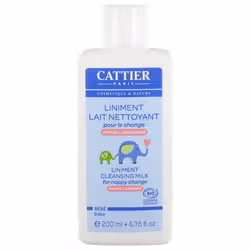 CATTIER BEBELiniment lait nettoyant pour le changeHypoallergéniqueAmande douce et Beurre de cocoCosmétique biologique200mlLe Liniment Cattie nettoie en douceur les fesses de bébé. Sa texture onctueuse forme un film protecteur qui isole la peau de l'humidité et du frottement des couches. Enrichi en huile d'amande douce bio et beurre de coco bio, il apaise les irritations, prévient les rougeurs et soulage les sensations d'inconfort.Principaux actifs :- Liniment oléo-calcaire : mélange d'eau de chaux et d'huile.Le liniment est une recette ancestrale pour apaiser et nettoyer les fesses des bébés et les protéger des agressions. Le calcium de l'eau de chaux et l'huile permettent d'hydrater la peau de bébé.- Beurre de coco bio : nourrissant, surgraissant, antiseptique- Huile d'amande d'ouce bio : nourrissante, adoucissante, apaisante- Glycérine (origine végétale) : hydratante, lissante et adoucissante- Cire d'abeille : laisse un film protecteur sur la peau