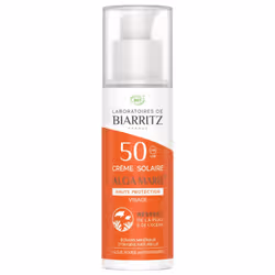 LABORATOIRES DE BIARRITZCrème solaire visage SPF50Cosmétique biologiqueTous types de peauxAux actifs marinsUtilisable par la femme enceinte et allaitanteFlacon pompe de 50ml. Format compact, pratique et facile à transporterLa Crème solaire Visage SPF50 est à la fois un protecteur solaire efficace et un véritable soin cosmétique. En effet, sa formule non grasse, sans traces blanches, offrant de véritables propriétés hydratantes et matifiantes, sublime la peau et lui apporte confort et douceur. Pour lutter contre les effets nocifs du soleil, les écrans minéraux haute tolérance protègent des rayonnements UVA et UVB, tandis qu’Alga-Gorria®, extrait breveté d’algue rouge aux puissantes propriétés antioxydantes prévient les dommages cellulaires et s’oppose au vieillissement cutané prématuré.L’indice SPF50 convient aux peaux laiteuses, très claires ou sensibles au soleil (toujours sujettes aux coups de soleil) et à tous les phototypes exposés à un ensoleillement intense. La Crème solaire Visage SPF50 est également parfaitement adaptée à la pratique sportive car elle résiste à la transpiration (pas de produit qui coule dans les yeux et les irrite).