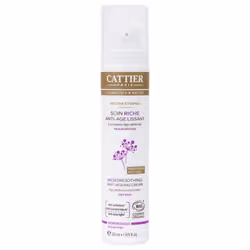 CATTIERNectar Eternel Soin Riche Anti-âge lissant Complexe âge défense Peaux sèches Prévention Anti-âge Anti-pollution Anti-lumière bleuePremière rides Cosmétique Biologique50mlLe soin Riche anti-âge lissant Nectar Éternel aide à retarder et corriger les premiers signes de l'âge. Le complexe âge défense1, innovation Cattier, composé d’argile montmorillonite et une association d’actifs d’origine marine et végétale, intervient à 3 niveaux :- Agit comme un bouclier contre les attaques radicalaires limitant ainsi la dégradation prématurée du collagène et de l’élastine du tissu cutané- Combat les signes visibles et invisibles de la pollution environnementale et lumineuse sur la peau- Apporte les minéraux essentiels à la peau pour la détoxifier et la dynamiser,Ainsi protégée, la peau retrouve éclat et douceur. Son élasticité et sa fermeté sont préservées. Les premières rides sont lissées. Une texture crème onctueuse et enveloppante, idéale pour le confort des peaux sèches grâce à la présence de beurre de Cupuaçu et d’huile de Jojoba.