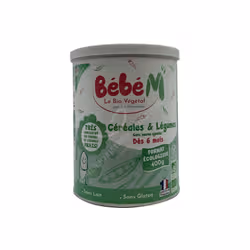 LA MANDORLE Bébé M Céréales et LégumesAgriculture biologique Dès 6 mois400g Complémentaire de la gamme infantile Bébé M, cette préparation instantanée est une céréale infantile aux légumes, certifiés en Agriculture Biologique. Elle répond aux critères réglementaires en vigueur tels que définis dans l'Arrêté du 1er juillet 1976 modifié et la Directive Européenne CE 2006/125.Cette préparation sans gluten, sans lait et sans sucre ajouté(1), permet dès 6 mois de découvrir de nouveaux goûts et textures grâce aux ajouts de légumes (petit-pois - carotte) issus d'Agriculture Biologique.Enrichie en algues marines, elle apporte un complément de nutriments naturels.(1)contient des sucres naturellement présents.