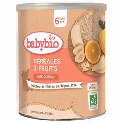 Babybio Céréales 3 Fruits avec Quinoa 6 Mois et + Bio 220 g sont des céréales infantiles biologiques aux 3 fruits avec du Quinoa.