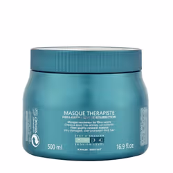 Description : -KERASTASE RESISTANCE MASQUE THERAPISTE 500ML -Masque reconstructeur pour cheveux épais sur-sollicités et abîmés. -Enrichi en sève de résurrection, il nourrit en profondeur la fibre capillaire en quête d’une réponse ultra-performante. La fibre capillaire est réparée, durablement revitalisé, pour des cheveux plus forts dans le temps. -Sa texture crème riche et onctueuse facilite l’application sur les longueurs. Le parfum aux notes fleuries procure un moment de bien-être à l’application.